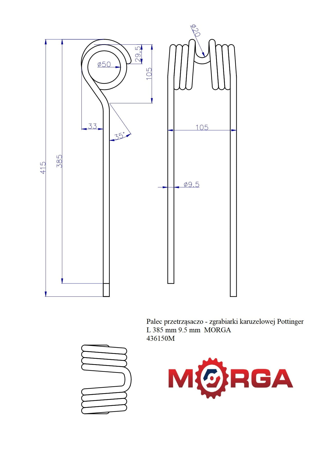 Palec przetrząsaczo - zgrabiarki karuzelowej Pottinger L 385 mm 9.5 mm malowane proszkowo MORGA