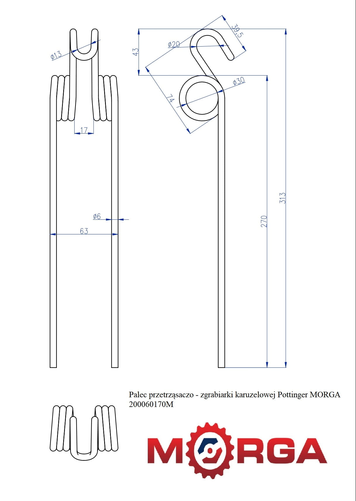 Palec przetrząsaczo - zgrabiarki karuzelowej Pottinger malowane proszkowo MORGA