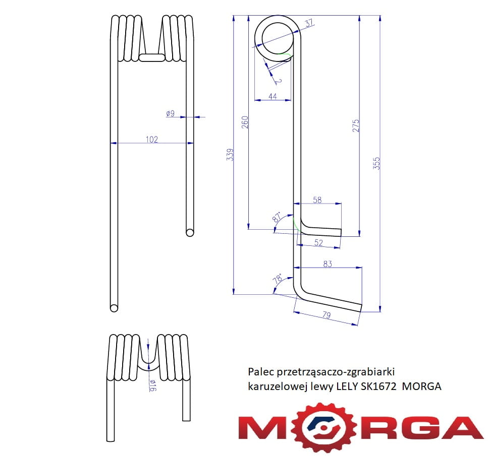 Palec przetrząsaczo-zgrabiarki karuzelowej lewy LELY SK1672 malowane proszkowo MORGA