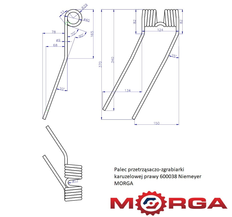 Palec przetrząsaczo-zgrabiarki karuzelowej prawy 600038 Niemeyer malowane proszkowo MORGA