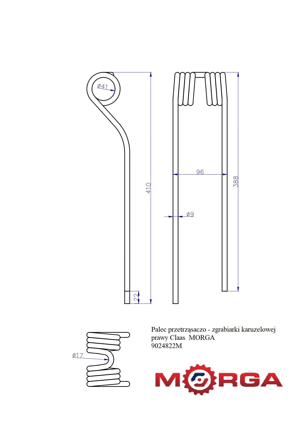 Palec przetrząsaczo - zgrabiarki karuzelowej prawy Claas 9024822 malowane proszkowo MORGA