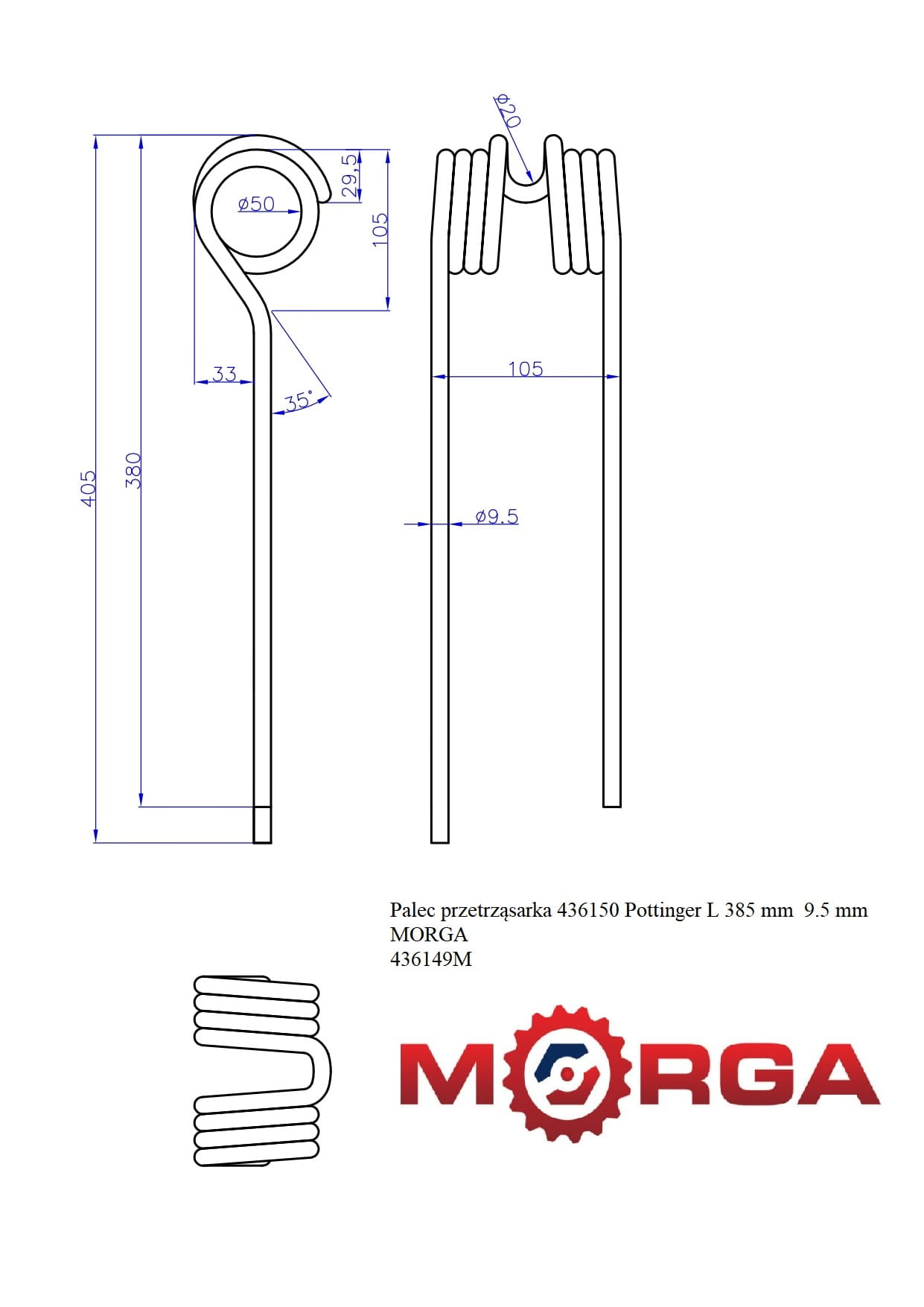 Palec przetrząsarka 436150 Pottinger L 380 mm 9.5 mm malowane proszkowo MORGA