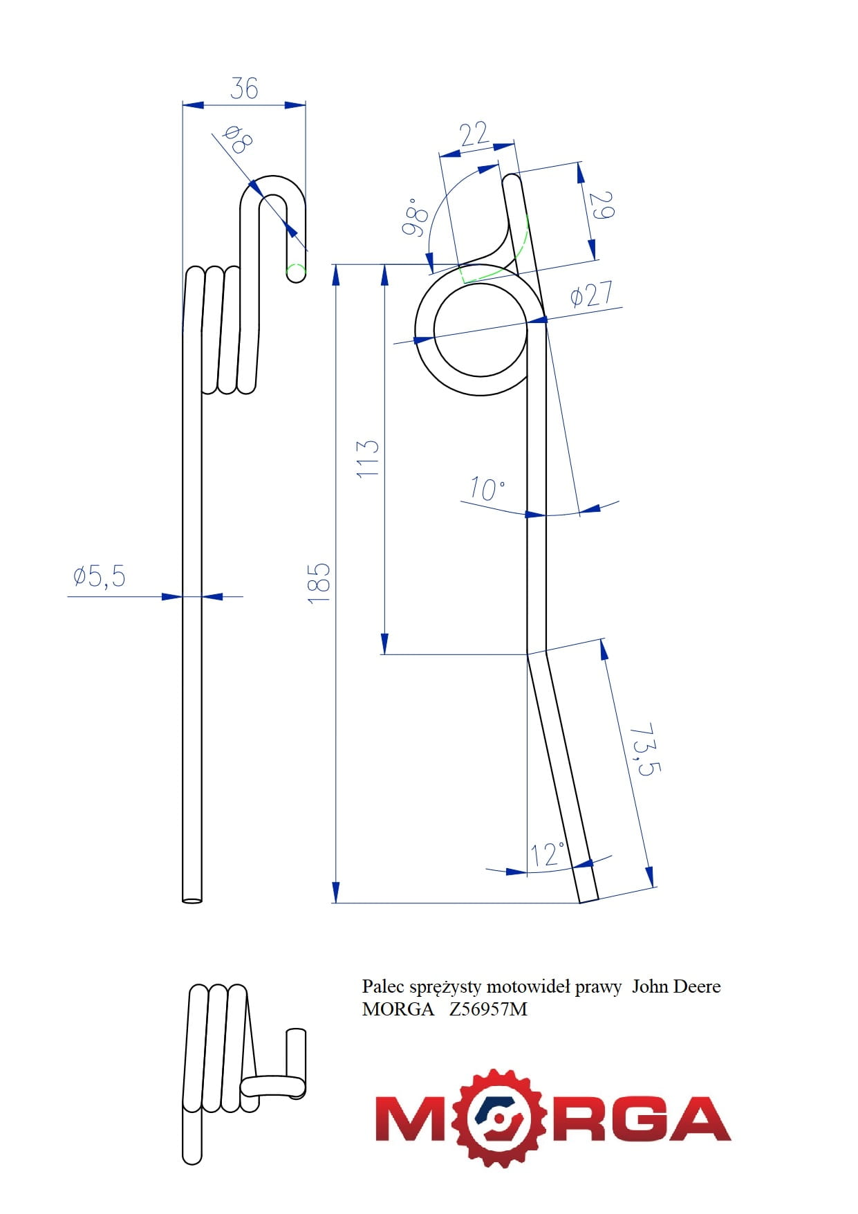 Palec sprężysty motowideł prawy Z56957 L 220 MM John Deere malowane proszkowo MORGA