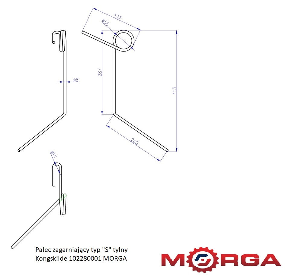 Palec zagarniający typ "S" tylny Kongskilde malowany proszkowo MORGA