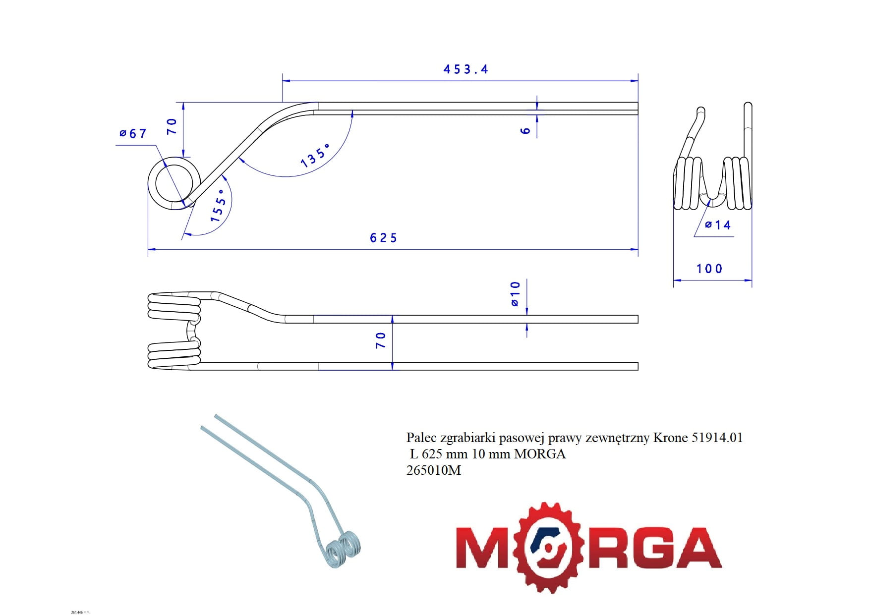 Palec zgrabiarki pasowej prawy zewnętrzny Krone 51914.01 malowane proszkowo L 625 mm 10 mm MORGA