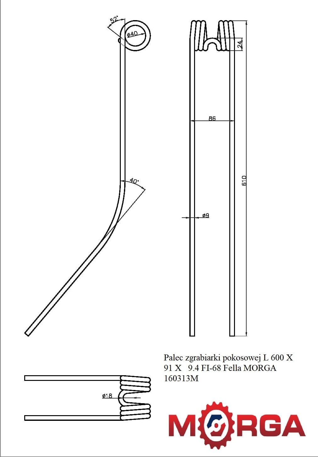 Palec zgrabiarki pokosowej L 600 X 91 X 9.4 FI-68 Fella malowane proszkowo MORGA