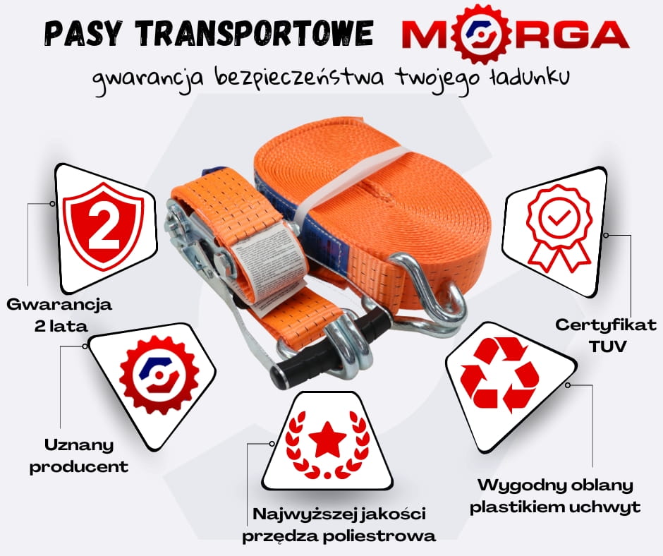 Pas transportowy, ściągacz 5T 12m szer. 50mm komplet z klamrą wzmocniony 330 mm ERGO z atestem, MORGA